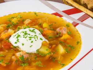 - Hotovú polievku nalejte na taniere, pridajte do každej taniere kyslá smotana a byliny.