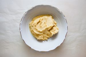 - Do cíceru pridajte citrónovú šťavu, soľ, cesnak, tahini, vývar (100 – 120 g) a olivový olej. Prelomíme mixérom až do uniformity.