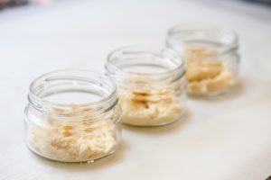 - Nakrájajte zeleninu na malé kocky a dajte ich do pohárov hummus.