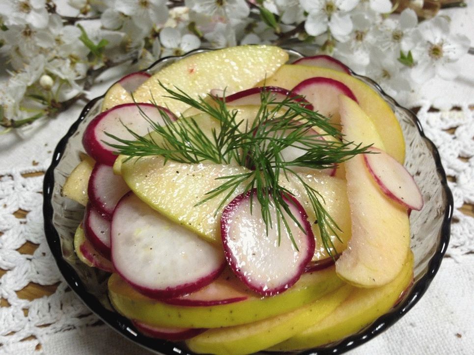 Odporúčam vám doma uvariť chutný šalát z reďkoviek a zeleného jablko. Jarný, osviežujúci a ľahký šalátový dresing je ideálny pre desiatu.