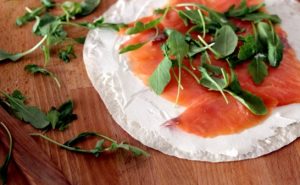 Do tvarohu pridajte ľahko osolený losos (½ časti) a posypeme rukolou (½ dielu).