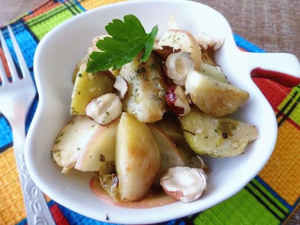 Bruselkový klíčok šalát s jablkom, varený v Doma bude perfektnou možnosťou občerstvenia, ak budete chcete schudnúť, držať sa vpravo alebo diétne napájanie. Tento šalát má veľmi nezvyčajnú kombináciu prísady. Môžete to urobiť za 15 – 20 minút.