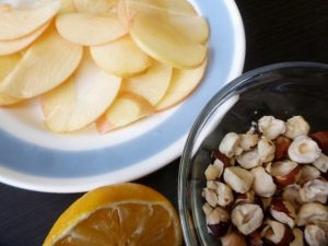 - Jablká nakrájajte na tenké plátky, posypte citrónovou šťavou, aby plátky nestmavli. Lískové orechy sa odosielajú do mikrovlnnej rúry jednu minútu nastavte výkon na 800 wattov.