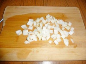 - Z papriky nakrájanej na semená, septum a stopka. Kockovú dužinu nakrájajte na kocky.