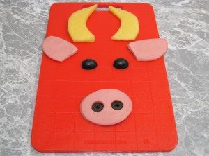 - Posypeme na vrchole nadýchanou vrstvou strúhaného proteínu. ozdobiť takto: rezané uši a nos z klobásy, rohy zo syra, nosné dierky, oči, mihalnice – z olív.