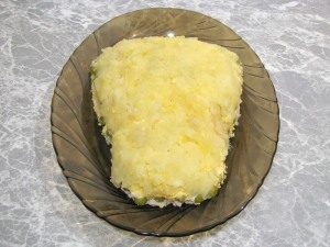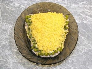 - Začneme zbierať náš šalát. Položte všetko na misku pripravené ingrediencie vo vrstvách (každá vrstva je rozmazaná) kyslá smotana a trochu soli) v tvare býčieho hlavy v tomto poradí: filé, hrach, žĺtky, zemiaky.