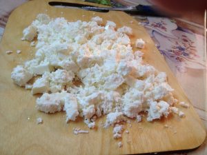 - Syr feta nakrájajte na kocky alebo rozdrvte nožom na malé kusov.