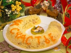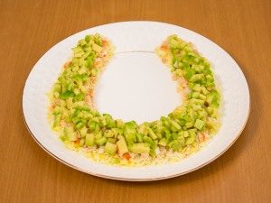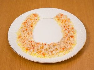 - Začneme zbierať náš šalát. Položte na misku vo vrstvách (rozmazanie každej vrstvy majonézou) vo forme pripravenej podkovy prísady v tomto poradí: vajcia, krabie mäso, avokádo, kaviár (časť ponechaná na dekoráciu).