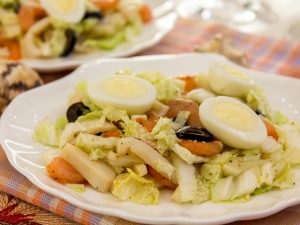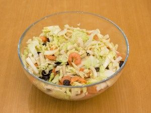 - V odmernej miske kombinujte chobotnicu, olivy, kapustu, krevety.