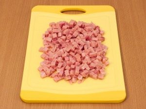 - Šunka (alebo iná chudá klobása, a ak umožňuje čas variť mäso) nakrájané ostrým nožom na úhľadné kocky.