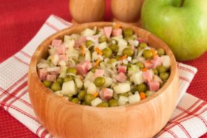 - V odmernej miske kombinujte jablká, kyslá kapusta, šunka, cibuľa, hrach (odkvapkajte tekutinu), ochutte olivou olej podľa chuti.