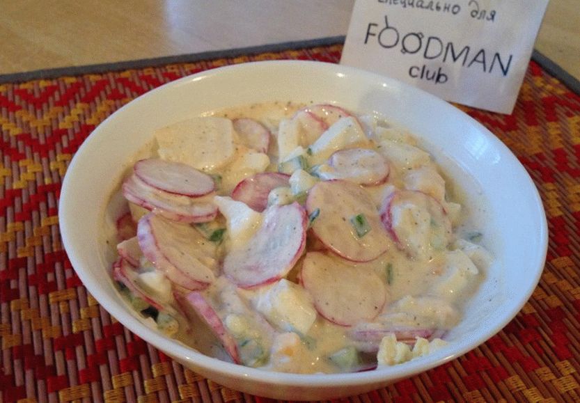 Veľmi chutný a výdatný šalát. Môžete to dokonca nazvať krajinou šalát. Ak pestujete cibuľu a reďkovky, nezabudnite skúste pripraviť taký šalát.