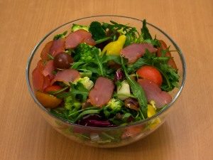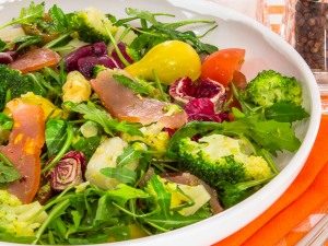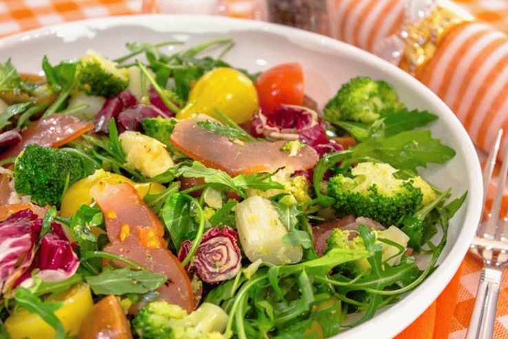 - Vo veľkej šalátovej mise zmiešajte carpaccio, paradajky, brokolicu, špargľa, šalát.
