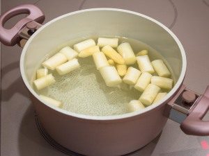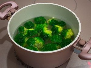 - Brokolica roztriedená na kvetenstvo, tiež nižšia vo vriacej vode, varte päť minút.