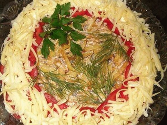- Šalát rozprestierame vo vrstvách: prvou vrstvou je kapusta (soľ, korenie) nepovinné); druhá vrstva je mrkva (zmiešané varené a surové, trochu sójovej omáčky a majonézy); tretia vrstva – cvikla s majonézou; štvrtým je mäso, predtým korenené majonézou; na piatej vrstve – jemne nakrájanú cibuľu; Šiesta vrstva je doplnená zemiakmi s majonézou. Najlepšie v kruhu dajte paradajky a posypte strúhaným syrom. Ozdobte vetvičkami kôpr a petržlen.