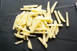 - Surové zemiaky sa tiež nakrájajú na prúžky a potom sa smažia. Mali by to byť hranolky.