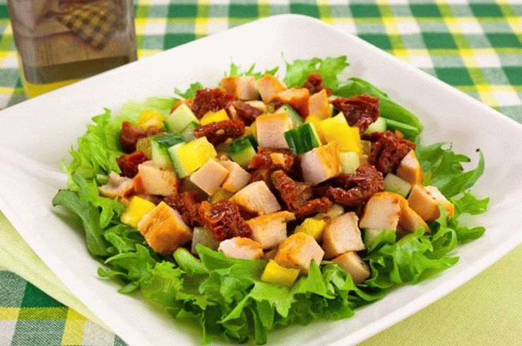 Originálny a chutný kurací šalát so zeleninou. Kuracie plechovky fajčiť a doma môžete variť s vareným filé. ocot stôl možno nahradiť octom jablčného muštu.