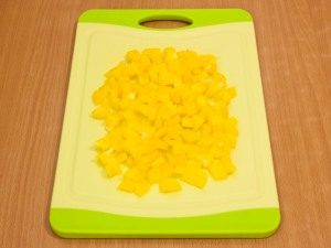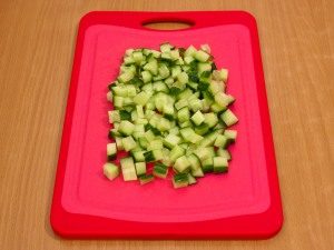 - Nakrájajte uhorky, papriku, kuracie mäso na malé kocky.