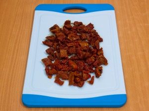 - Prebytočný tuk odstráňte z paradajok sušených na slnku papierom uteráky, narezané na malé kúsky.
