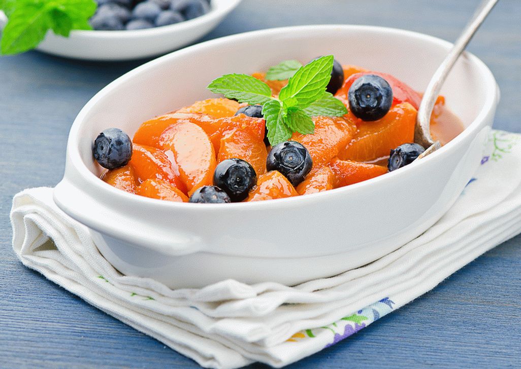 - Broskyne a šupky na plátky. Podiel na podávajte jedlo s vysokými okrajmi a pridajte čučoriedky.