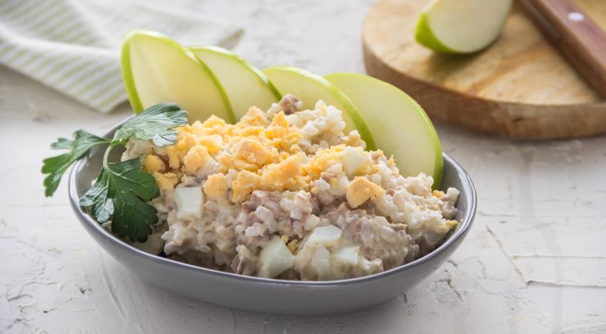 - Zmiešajte pečeň, ryžu, vajcia a cibuľu. Sezónu s domovom s majonézou, soľou a korením. Šalát zdobíme plátky jabĺk. Prajem pekné chuť k jedlu!