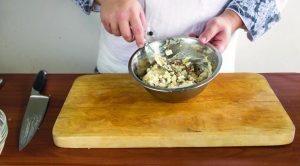 - Ošúpeme cibuľu a nakrájame na malé kocky. Varte vajcia tvrdo varené, olúpané a nakrájané na malé kocky. S tresčou pečeňou vypustite maslo a jemne nasekajte.