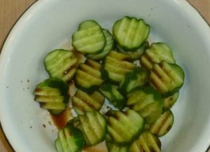 - Vyberáme uhorky z marinády, pridávame do zelene vodu dresing a posypeme semenami.