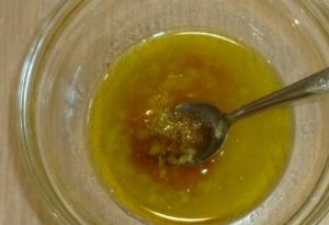 - Zmiešajte olej, citrónovú šťavu, nakrájaný cesnak, soľ a korenie.