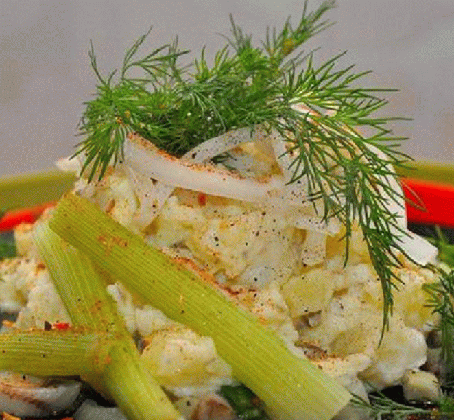 - Dajte cibuľu a kôpor na zemiaky, ozdobte šalát kurkuma.