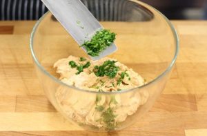 Do pripravenej zmesi paradajok pridajte nasekanú petržlenovú vňať a premiešajte.