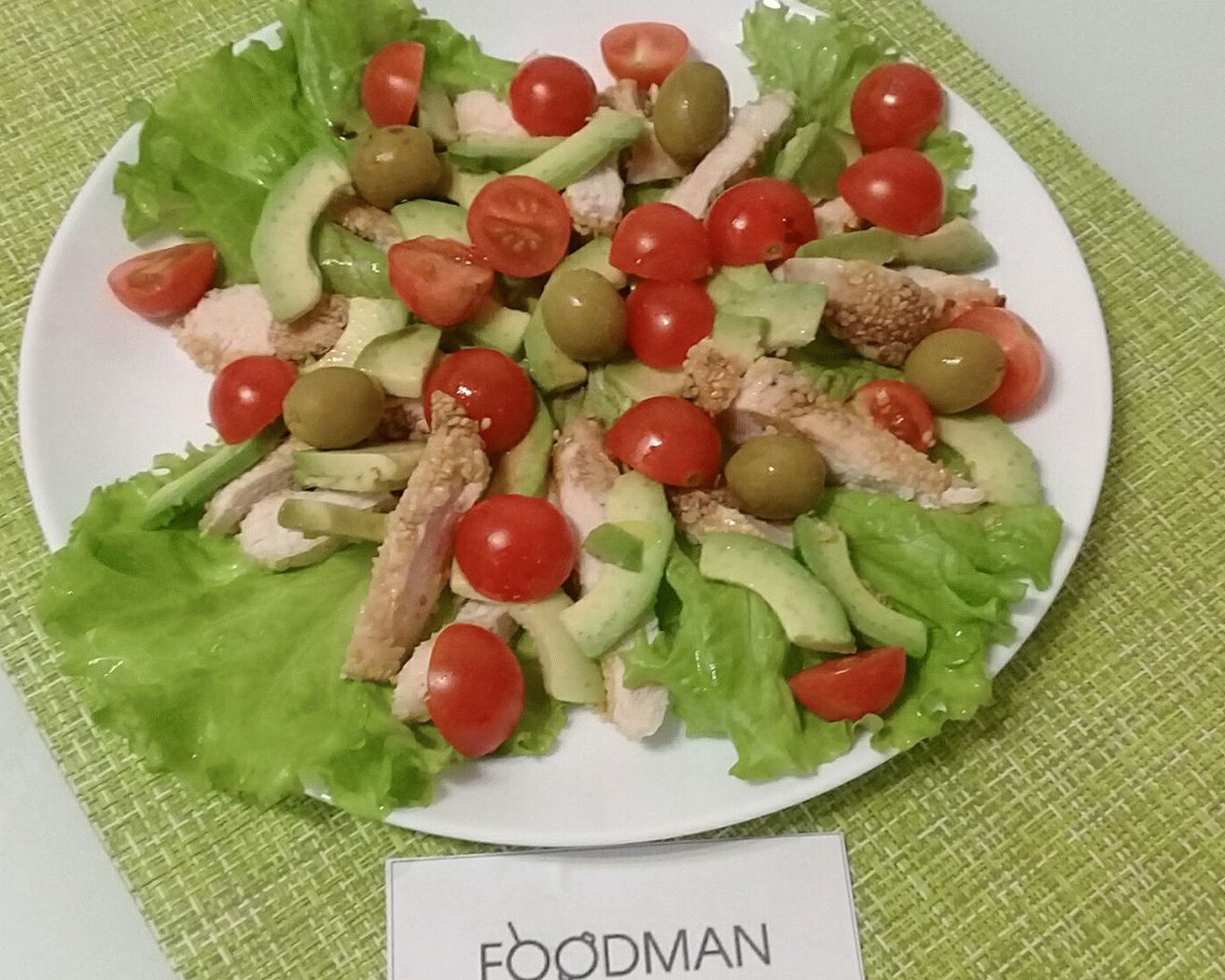 - Nasekané kuracie prsia dajte do sezamu na listoch hlávkového šalátu, avokádo, cherry paradajky, olivy.