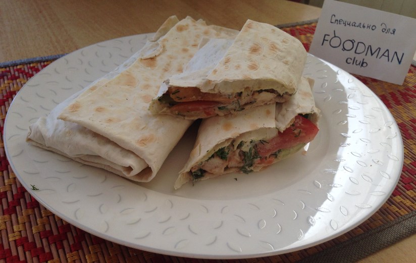 - Zozbierame shawarmu, potom najskôr namažte pita s tvarohom dajte kuracie mäso a zeleninu. Ochutíme paprikou, čiernym korením a sušený cesnak. Otočte shawarmu.