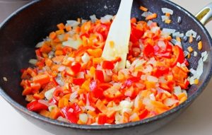 - Nakrájanú cibuľu, mrkvu a papriku opečte v rastlinnom oleji.
