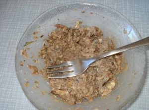 - Šprinte olej z nádoby a šproty rozdrvte vidličkou.