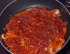 - Mrkvu smažíme s cibuľou na masle, nalejeme lyžičkou sójová omáčka. Fritujte 3 minúty. Paradajkovú pastu opečte 3 minúty nalejte polievkovú panvicu do vývaru ao 5 minút neskôr.