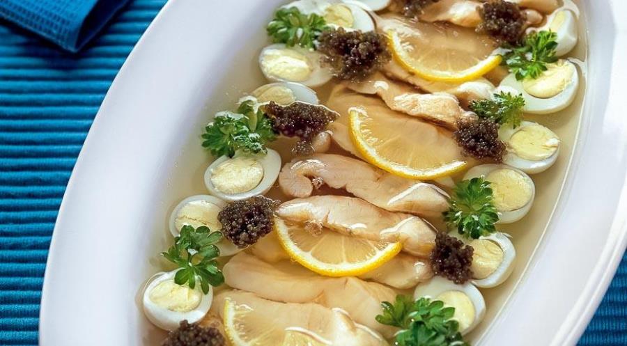 Vložte sterlet do stredu a vložte kúsky medzi kúsky citrón, položte prepeličie vajcia okolo misky a ozdobte tanier greeny. Nalejte všetok vývar a nechajte ho vychladnúť v noci.