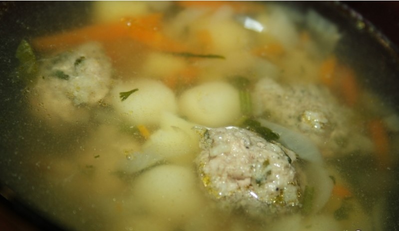 - Po povarení zemiakov po dobu 5 minút, pridajte do polievky mäsové guľky, soľ a korenie. Varenie 8-10 minút.