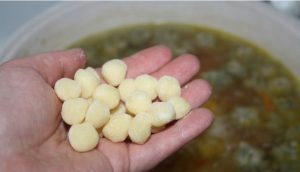 - Vyrábame z neho malé gule s veľkosťou 1,5 – 2 cm a zakrývame ich Film. Takéto halušky môžu byť zmrazené.