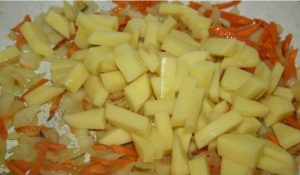 - V šaláte podávame cibuľu s mrkvou a rozširujeme ju zemiakové plátky, vavrínový list.