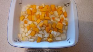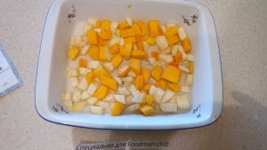 - Ošúpajte a jemne nakrájajte jablko a tekvicu.