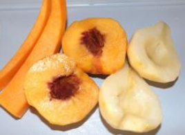 - Hrušky a broskyne dôkladne umyte, odstráňte šupku a semená. Ovocie a tekvica je potrebné nakrájať na plátky a nechať ich prejsť kombajn, získavanie zemiakovej kaše.