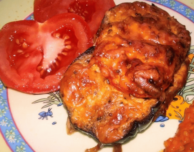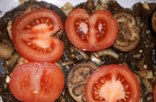 - Mäso rozložíme do pekáča a cibuľu rozložíme hore a cesnakom, potom vložte plátky baklažánu a paradajky.