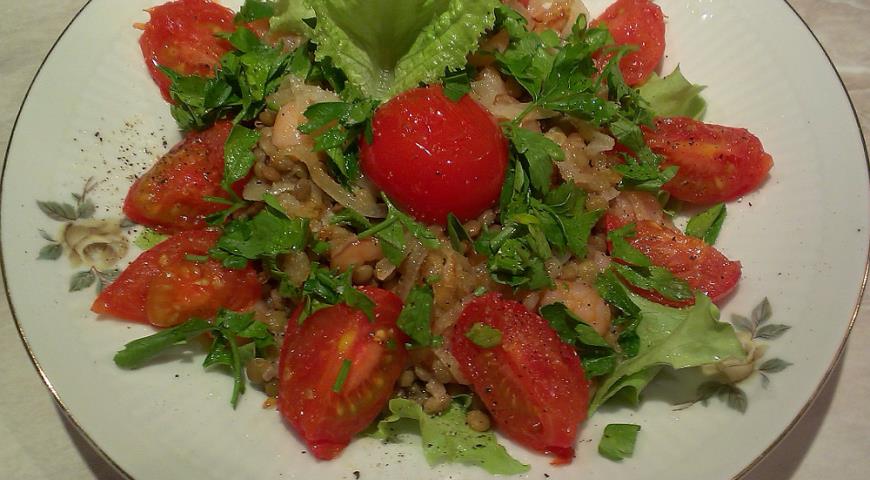 - Roztrhajte šalát rukami na malé kúsky a rozotrite doska. Na listoch šalátu rozprestierame šošovicu s krevetami a cibuľou s paradajkami. Soľ a korenie, posypeme citrónovou šťavou a posypeme petržlen.