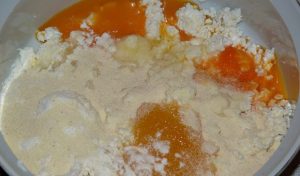 - V pripravenej zmesi nastrúhajte olúpané jablká. Ak je cesto veľmi tekuté, pridajte krupicu.