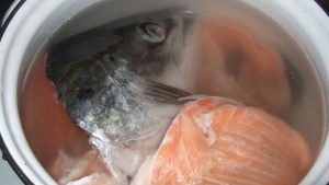 - Zložte v studenej vode hrebene, malé ryby, cibuľa a bobkový list.