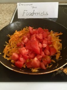 - Nakrájajte paradajky na malé kúsky a pošlite na panvicu ľahko vyprážaná mrkva a cesnak.