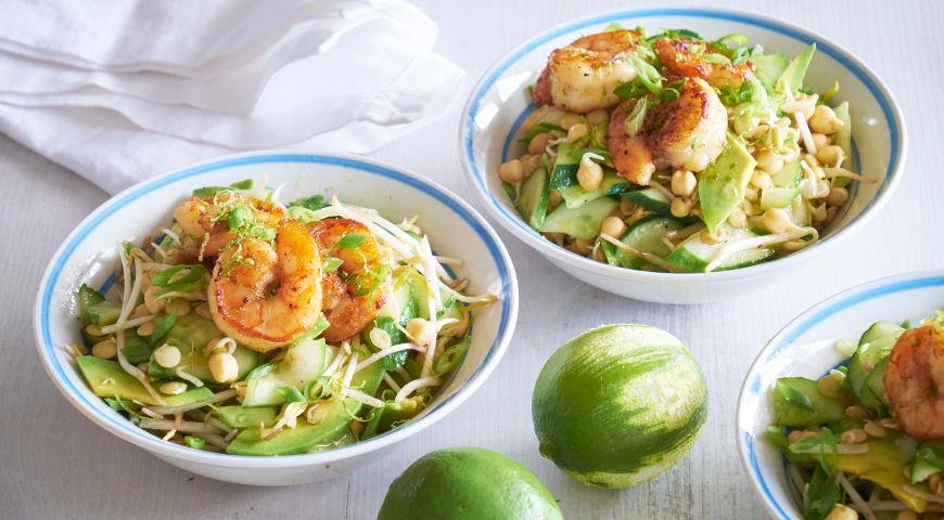 - Zmiešajte avokádo, sadenice, uhorky, posypeme korením, vodu Sezamový olej a natieraný na tanieroch. Rozprestierajte sa hore krevety a ihneď podávame.