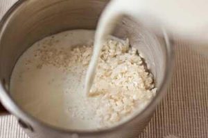 - Do ryže nalejte asi 2/3 šálky mlieka, premiešajte, dajte úplne absorbujte mlieko do ryže.