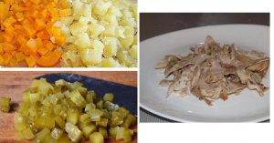 - Varené zemiaky, králičie mäso, uhorky, mrkva a jablko sa musí nakrájať na malé kocky. Všetky mixujú.