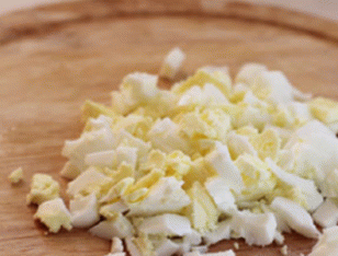 - Pridajte nasekané vajíčko a nakrájanú cibuľu do šalátu.